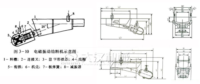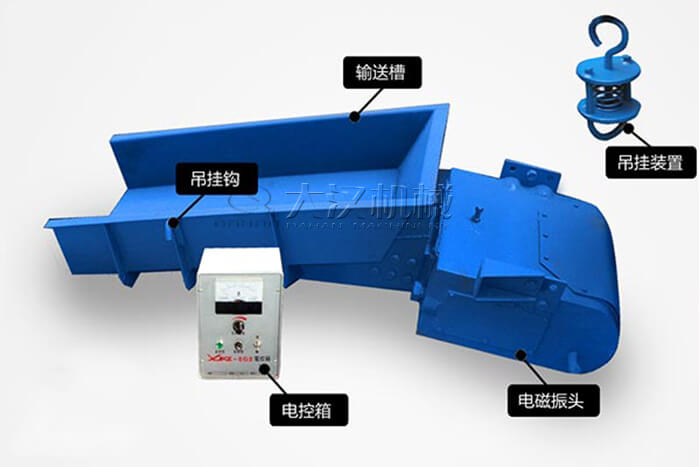 主要由料槽、電磁激振器、減振器組成。激振器又由電磁鐵(鐵芯和線圈)、銜鐵和裝在兩者之間的主振彈簧等構成,是產生振動的激振源,激振器的工作可以通過一定的控制裝置進行控制。