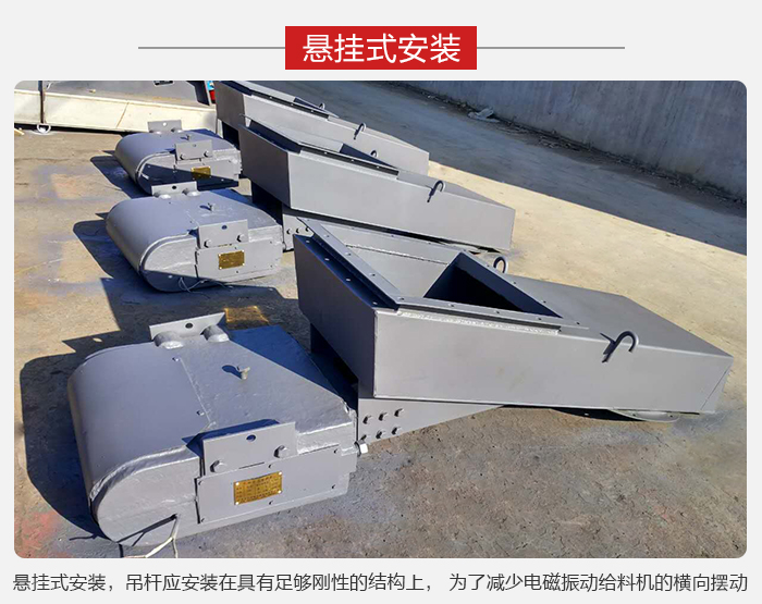 電磁振動給料機一般采用懸掛式安裝,吊桿應安裝在具有足夠剛性的結構上, 為了減少電磁振動給料機的橫向擺動, 懸掛吊桿應向外張開 10°左右布置。對于大型給料機, 為了維修和更換料槽方便,還應設置移動滑架。